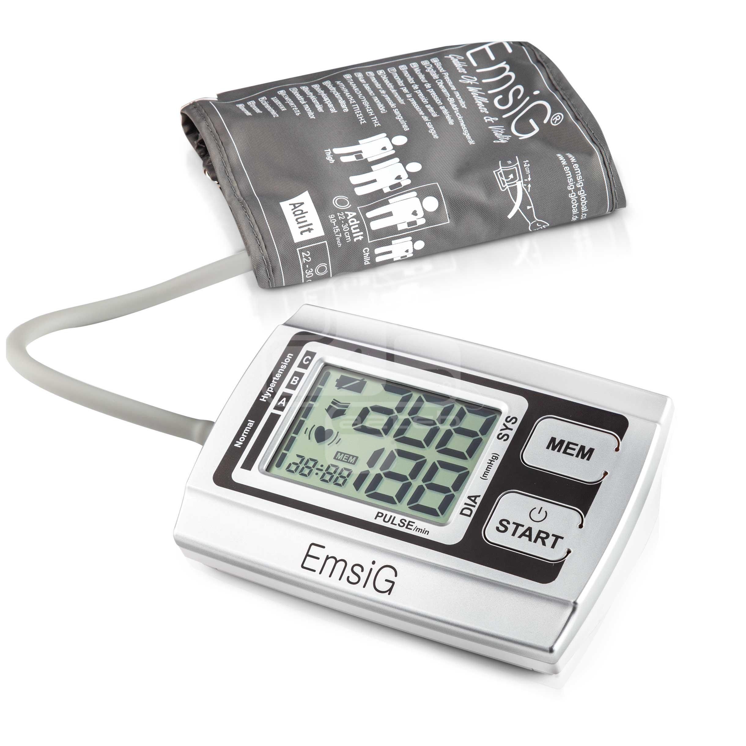 فشارسنج بازویی Emsig مجهز به کاف بازویی مناسب برای افراد با دور بازو L (22 الی 30 سانتیمتر) است. این دستگاه فشارسنج مجهز به صفحه نمایش LCD با رنگ پس زمینه سفید است. نمایشگر این دستگاه فشارسنج قادر به نمایش مقادیر SYS، DIA و Pulse است. همچنین قابلیت نمایش زمان و تاریخ، کاربر و وضعیت باتری دارد. این دستگاه فشارسنج از قابلیت هشدار کمبود توان باطری پشتیبانی می‌کند.